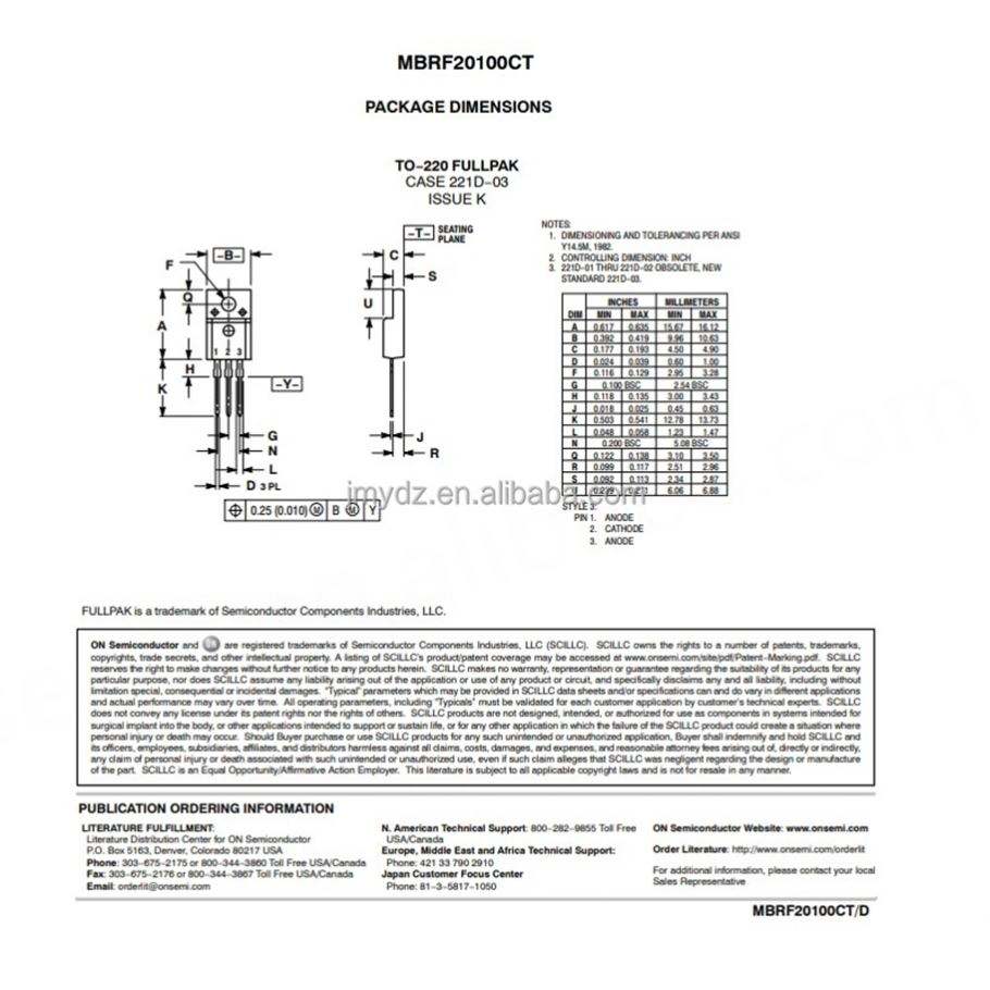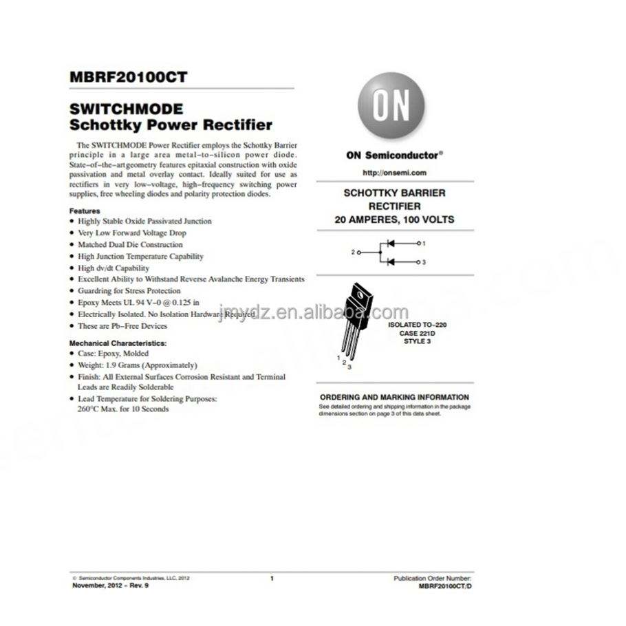 Diode Schottky MBRF20100CT TO220F, tension 100V, courant 10A