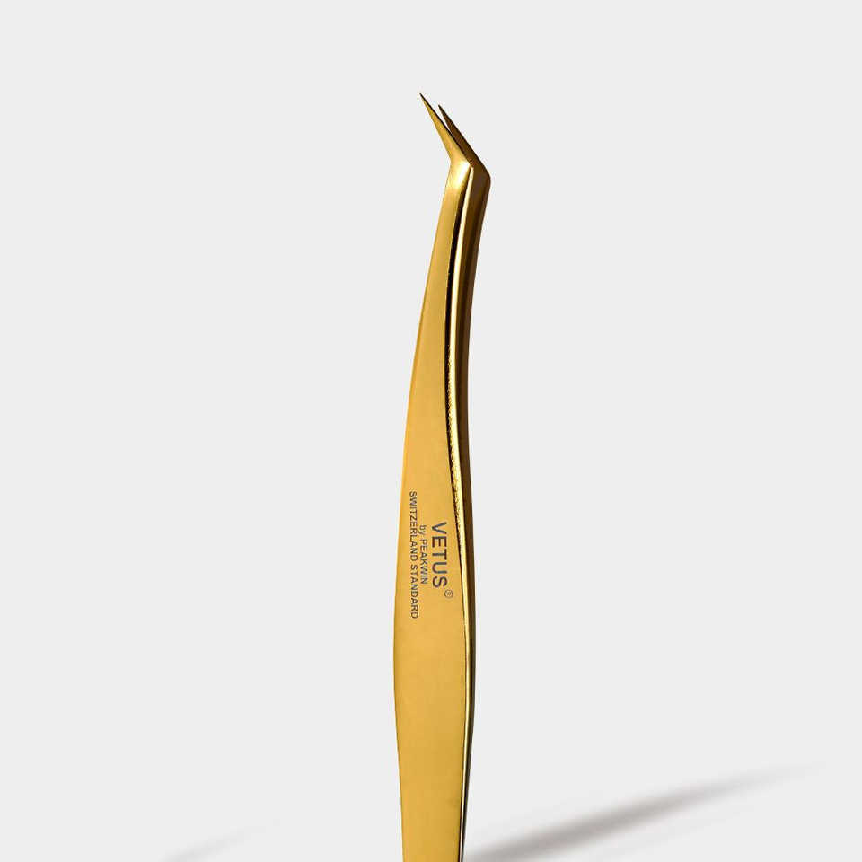Pince à épiler pour extensions de cils MCS-19 en acier inoxydable doré en forme de L avec pointes pointues, modèle à pointes en fibre