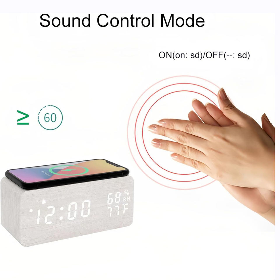 Réveil numérique en bois MDF avec affichage LED de la température et de l'humidité, commande vocale, pour salon, chargeur sans fil, logo personnalisé