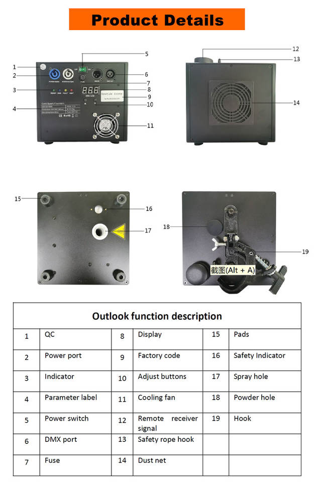 Nom du produit:Machine à étincelles froides en cascade inversée