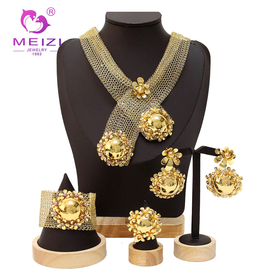 MEIZI JEWELRY Dubai Gold Plated Big Bracelet Ring Earrings Jewelry Set for Women 4 Pieces Wedding Banquet Party Adorn Gift