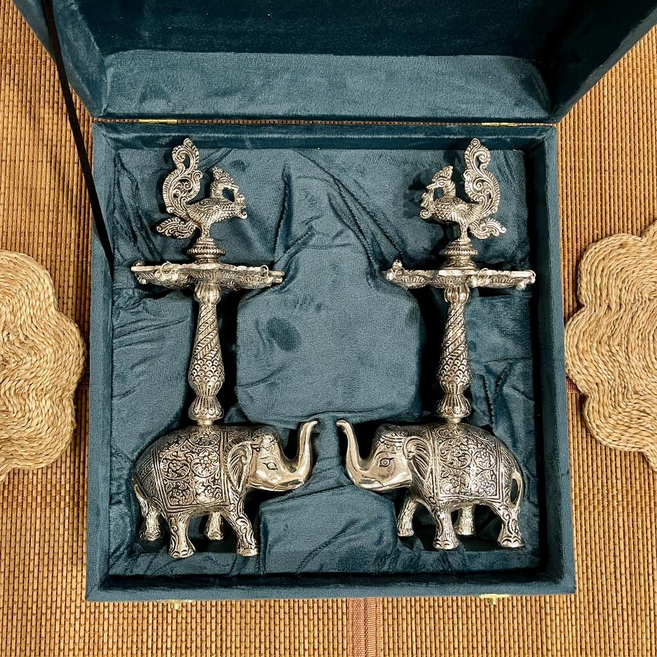 Artisanat métallique fait main, éléphant plaqué argent, forme SAMAI / DIYA, paire avec boîte en velours