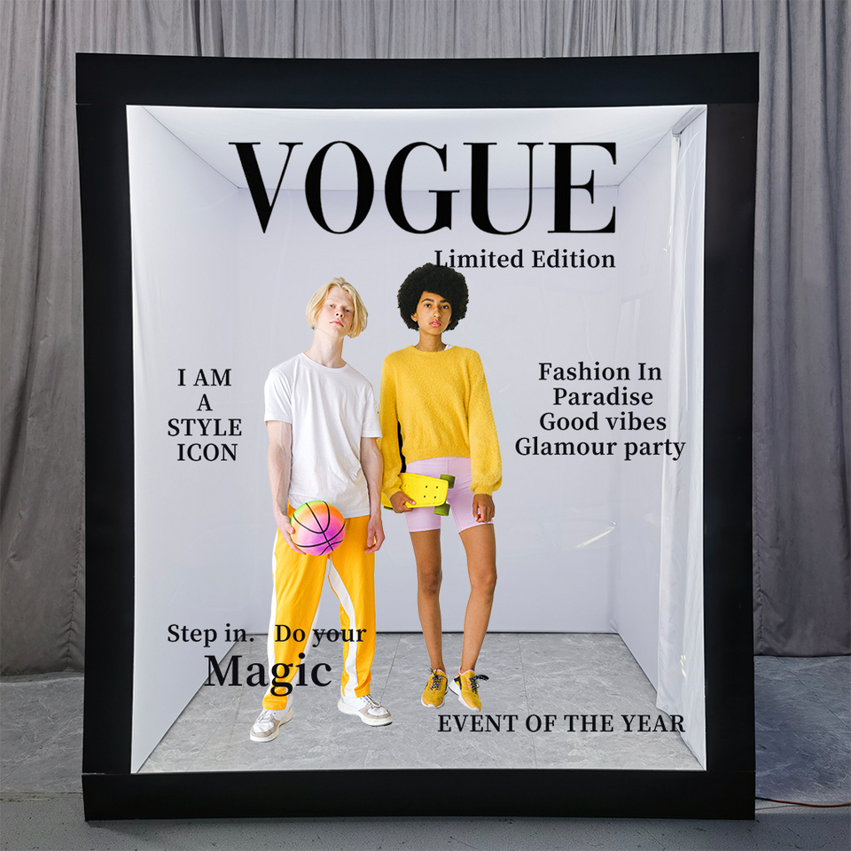 Boîte photomaton METO de style magazine pour événements d'entreprise - Personnalisation professionnelle de la toile de fond avec cadre en PVC facile à installer