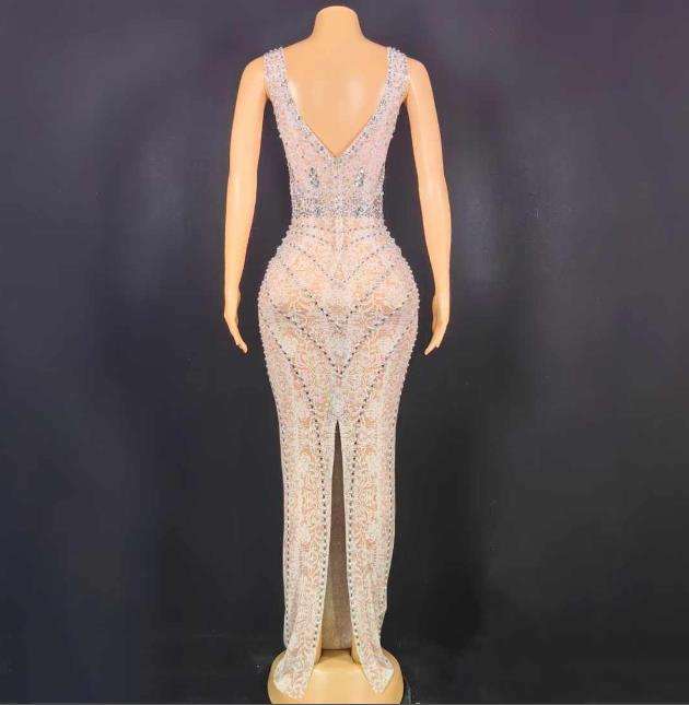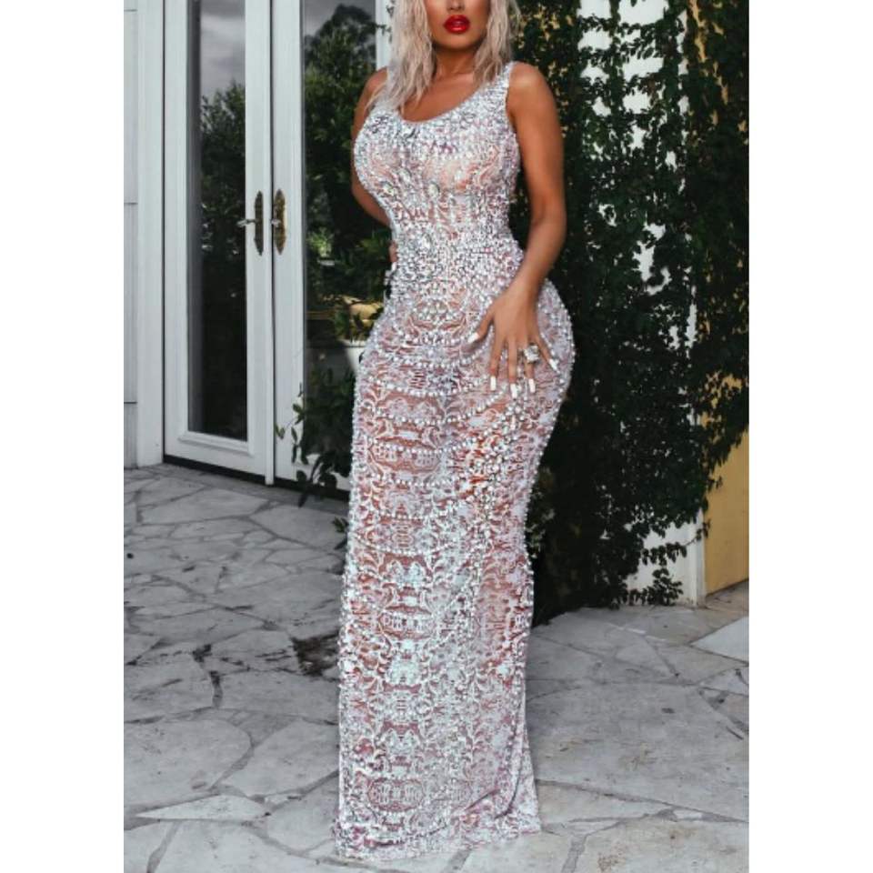 Robes de soirée longues en maille florale blanche à dos ouvert avec crêpe 3D brillant et perles de cristal MF Custom pour les soirées et les clubs