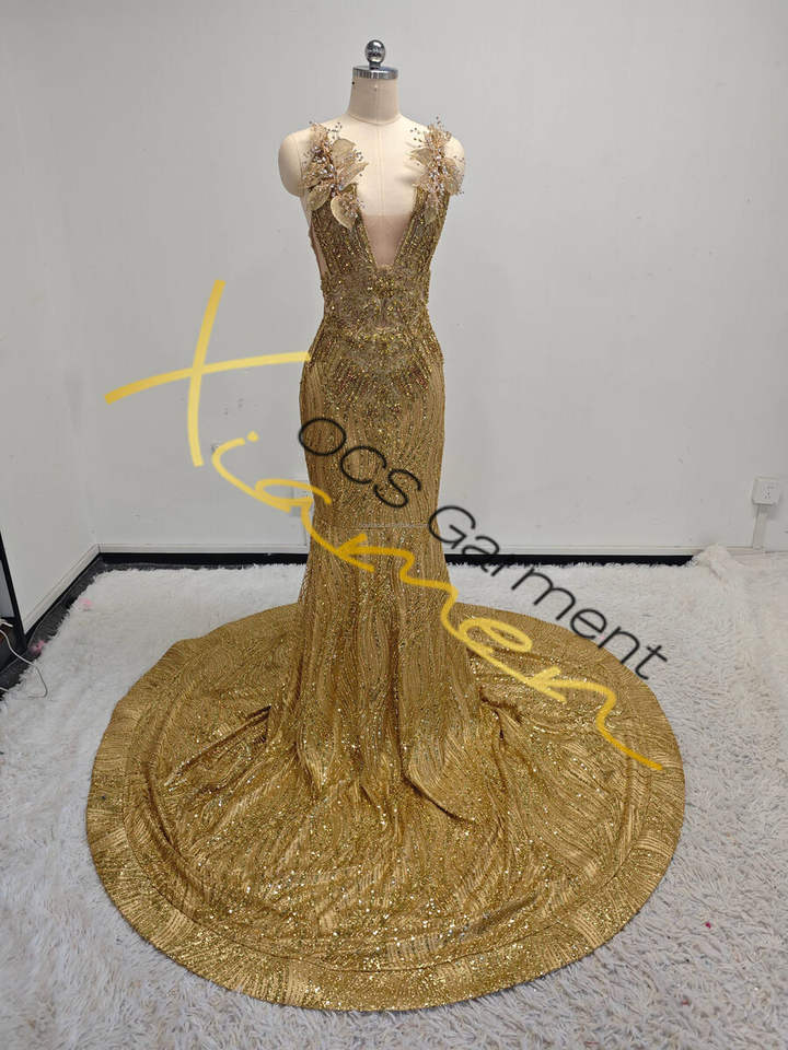 Robe de bal sirène élégante Novance, style moderne 3D, col haut, paillettes scintillantes, empire, longueur au sol, accents floraux