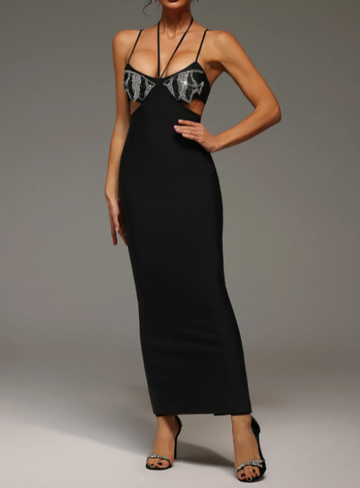 MF Populaire Tendance Strass Élégant Halter Sexy Évider Bodycon Long Bandage Robe à queue noire