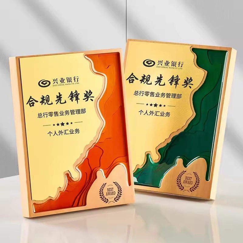MH-NJ0848 Nouveau Design Highend Vert Orange Acrylique Plaque D'autorisation Du Client avec Rectangle Trophée En Bois