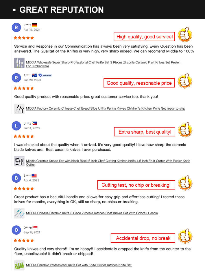 MIDDIA Professional Japanese Kitchen Chef Knife Set Disposable Ambidextrous PP Handle Satin Finish Knives Black Ceramic Zirconia