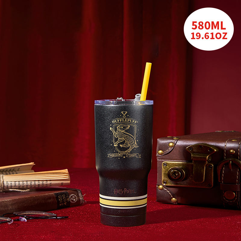 MINISO Série Harry Potter Hufflepuff Tasse à paille en acier inoxydable 580 ml avec pendentif universitaire, gobelet à eau portable anti-fuite