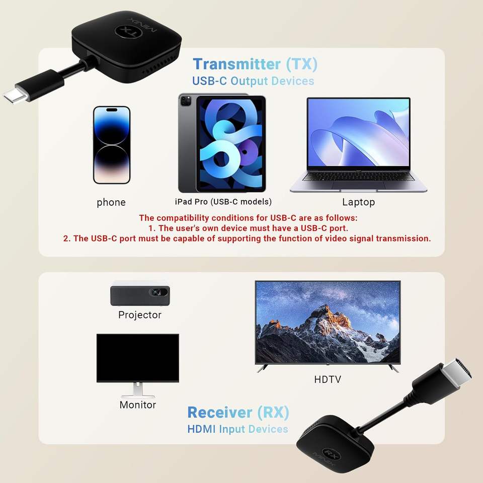 MINIX Émetteur Double HD Sans Fil 1 Récepteur Adaptateur USB-C Extension Multi-Écran 1080P 60Hz 164FT 50m WiFi 2.4GHz 5GHz