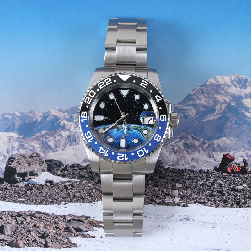 Montre automatique mécanique MINUTETIME Design NH35 Sub avec cadran Space Earth, mouvement en cristal de saphir, étanche 10 bars, en acier.