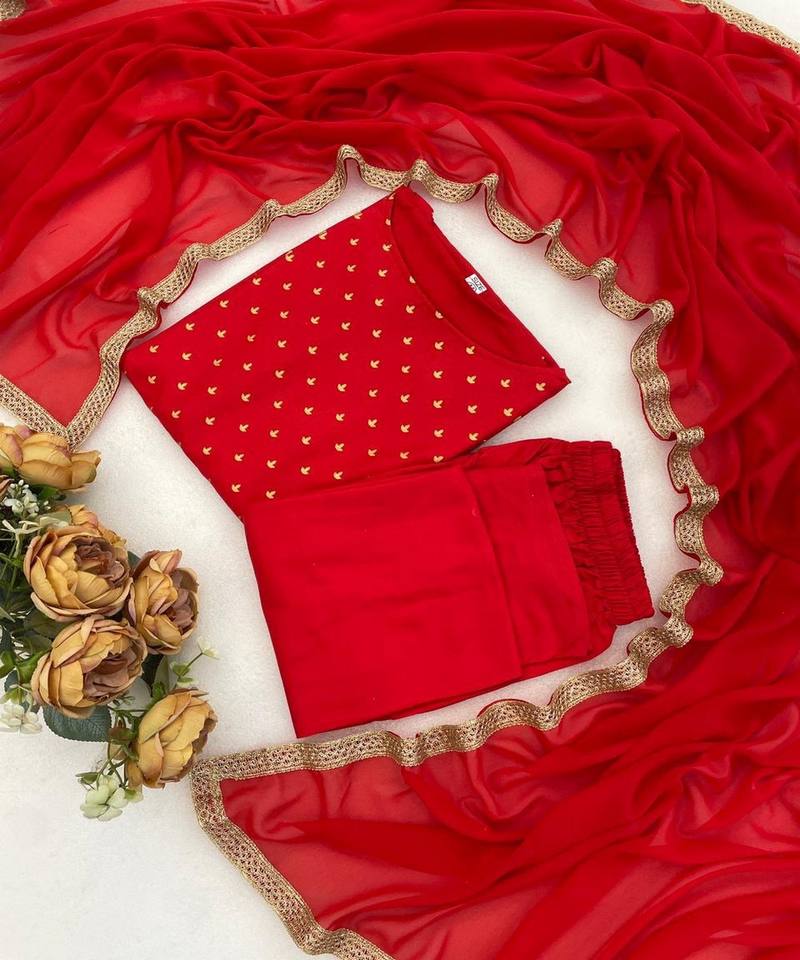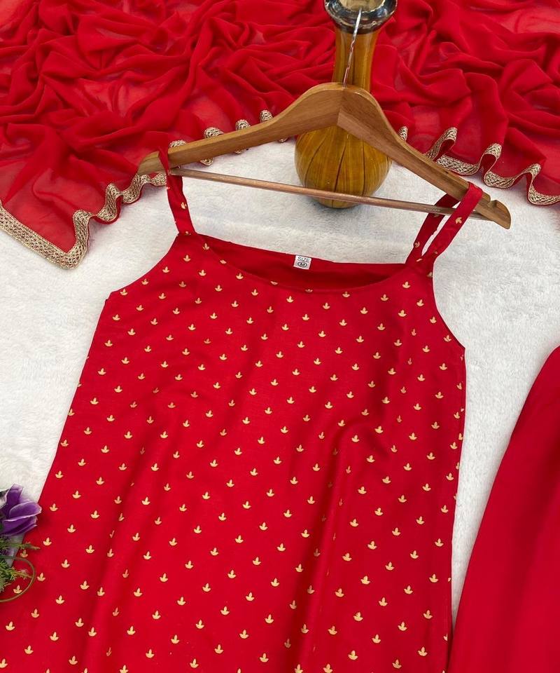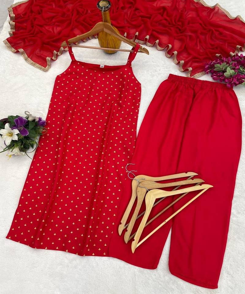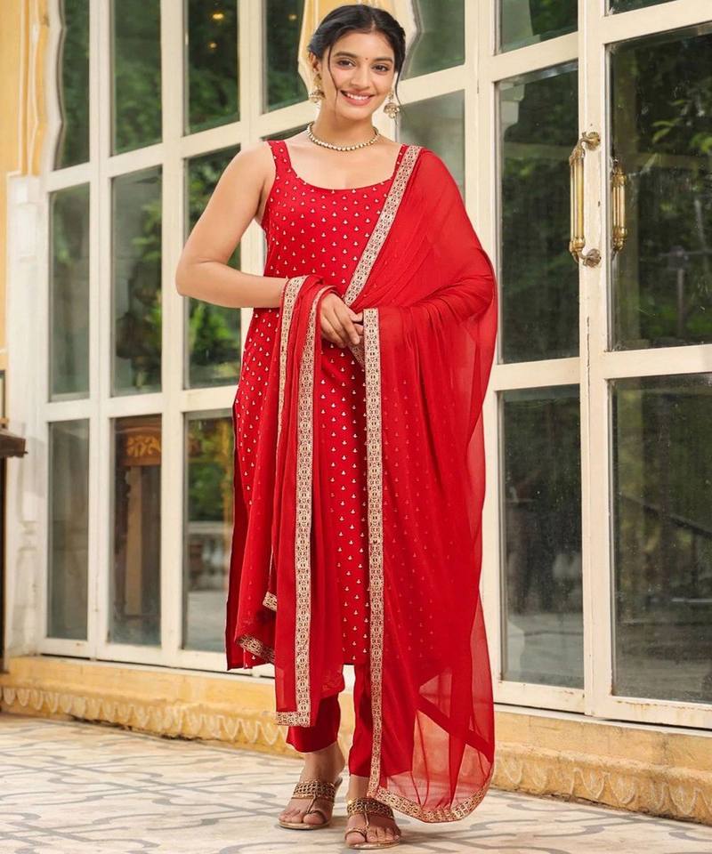 Ensemble haut et bas moderne en rayonne avec broderies métallisées et dupatta, tenue de fête, prix de gros, vêtement ethnique, tissage rouge de luxe