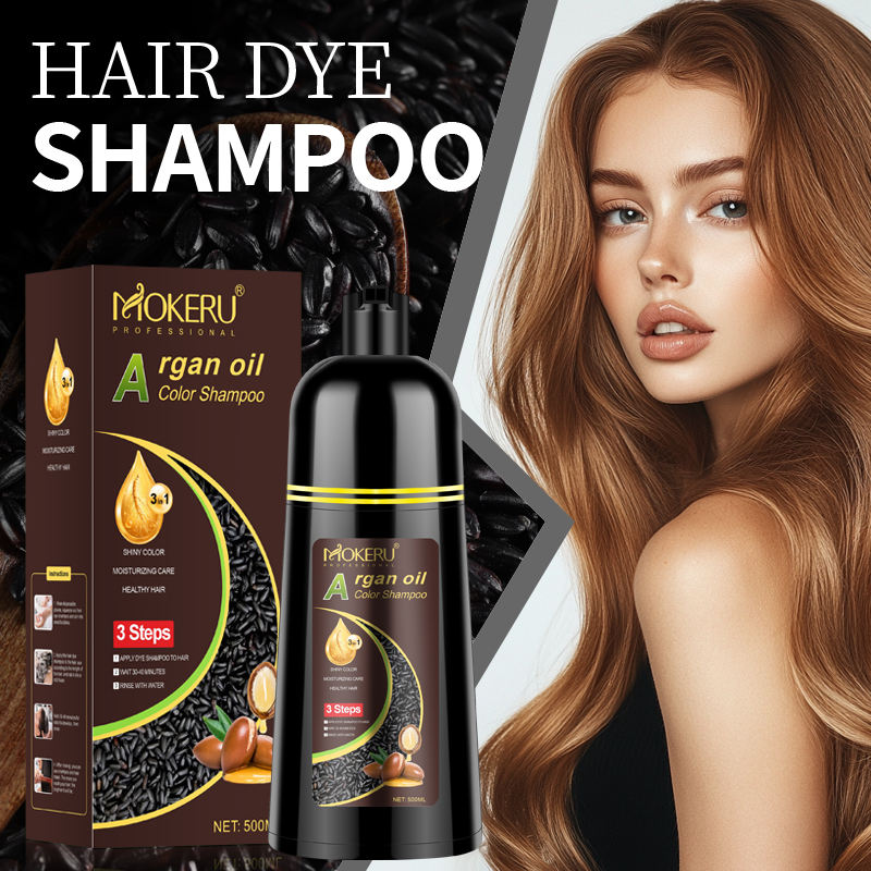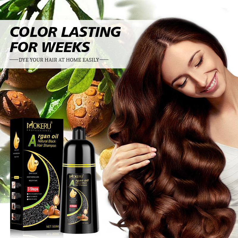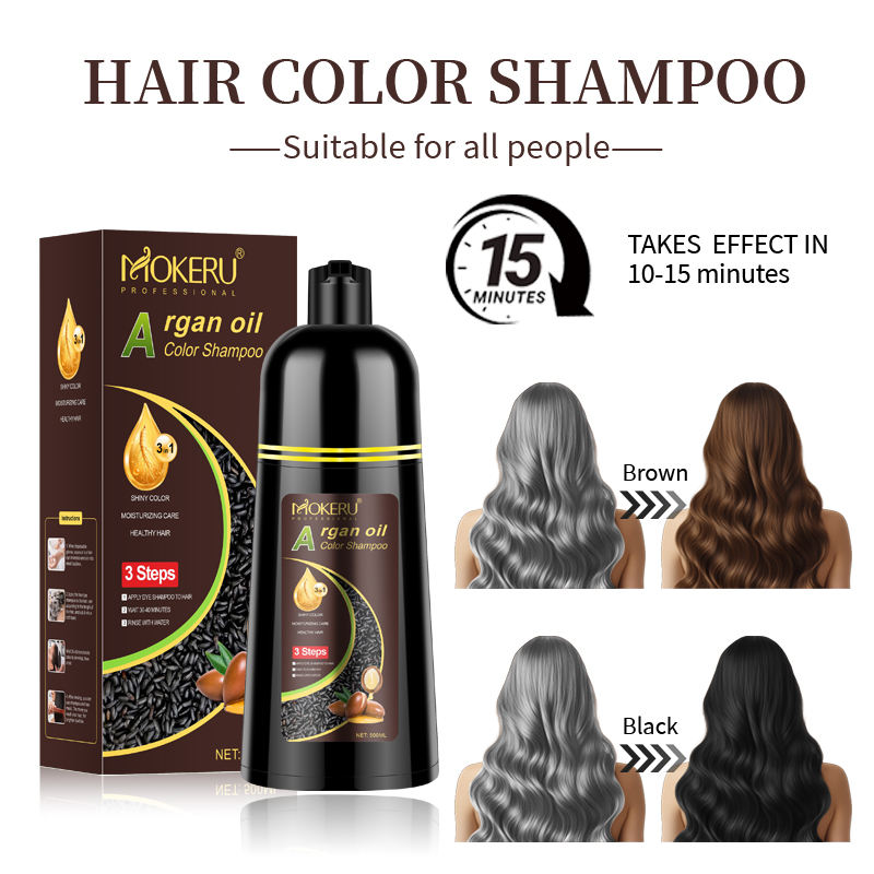 MOKERU Shampooing Colorant Cheveux au Riz Noir et Huile d'Argan, Teinture Naturelle Permanente 3-en-1, Couverture des Cheveux Gris Sans Ammoniaque, 500ml