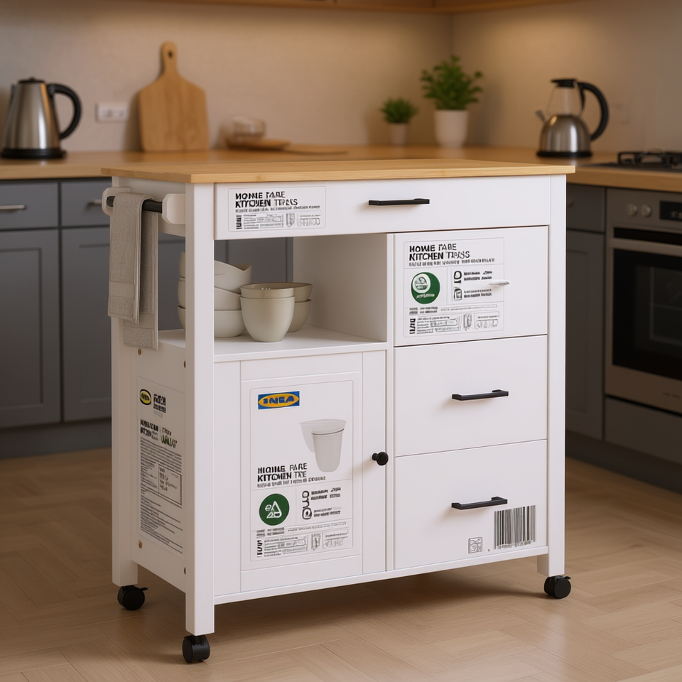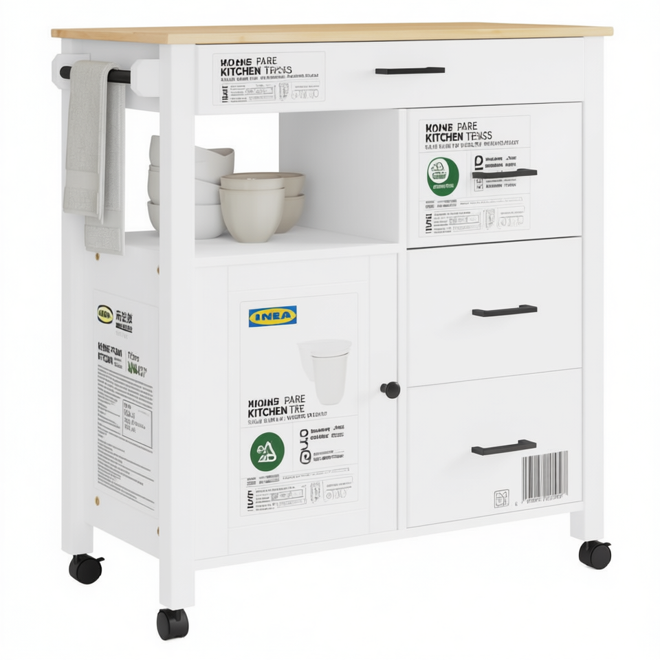 Monza Solid Wood Pine Kitchen Trolley 33.1x15.7x35.4 In White On Wheel Modern Design Kitchen Cabinet