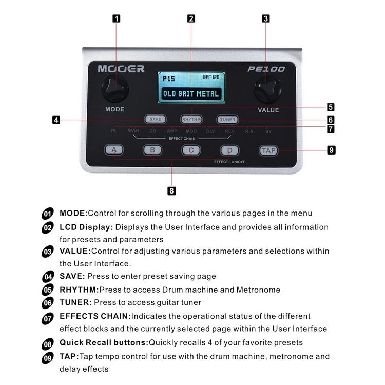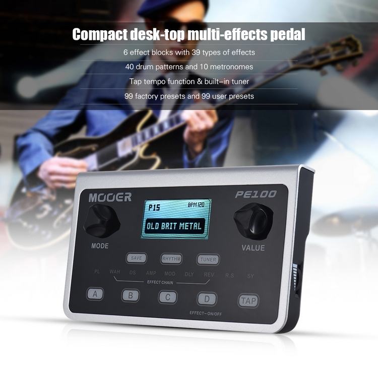 MOOER PE100 Processeur multi-effets portable Pédale d'effet guitare 39 effets 40 modèles de batterie 10 métronomes Tap Tempo