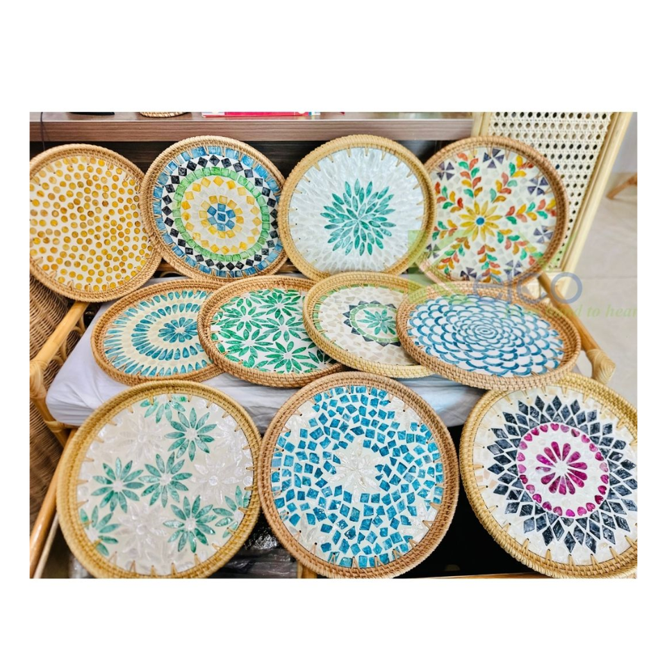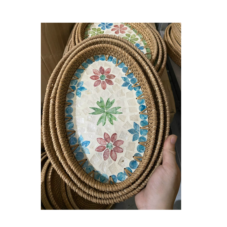 Plateau en rotin incrusté de nacre, assiette en coquillage