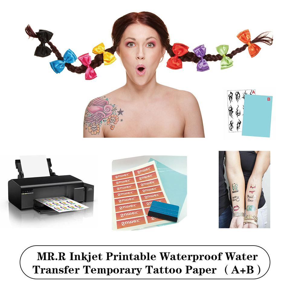 Papier de transfert d'eau imprimable à jet d'encre M R.R pour tatouage corporel temporaire format A4 (8.23 ''x 11.7'') avec 5 ensembles par paquet (A + B par ensemble)