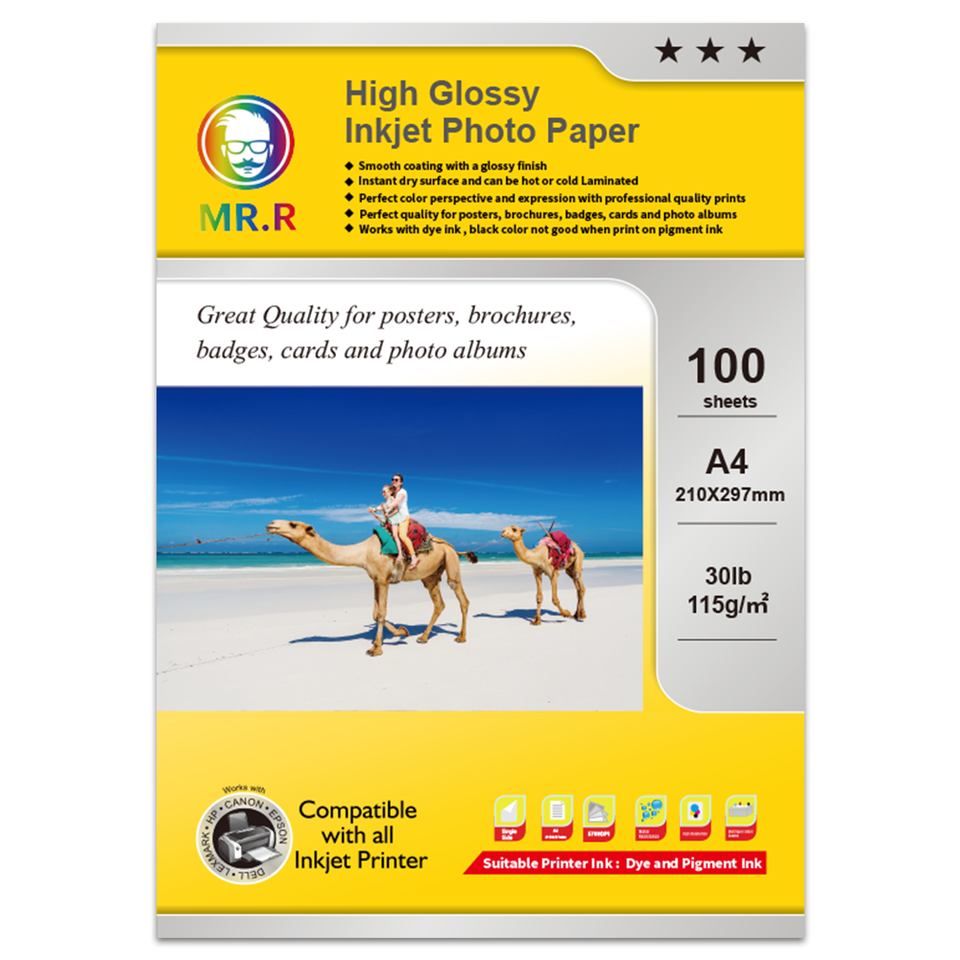 Papier photo jet d'encre brillant simple face MR.R 210x297mm avec 100 feuilles par paquet 115gsm 30LB