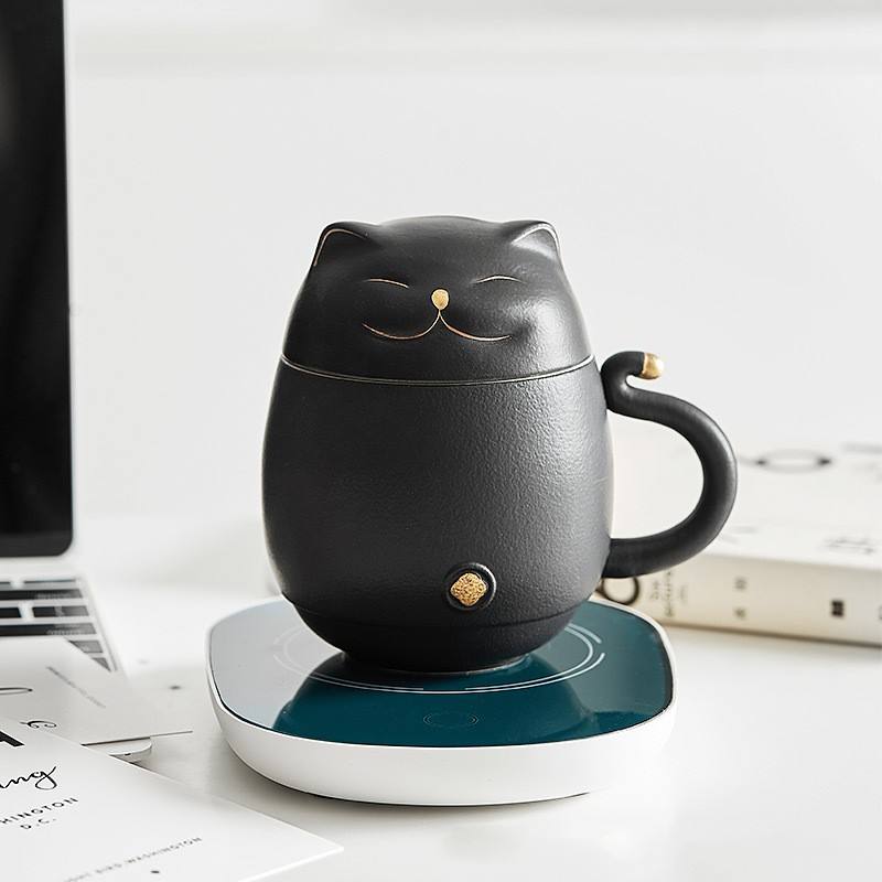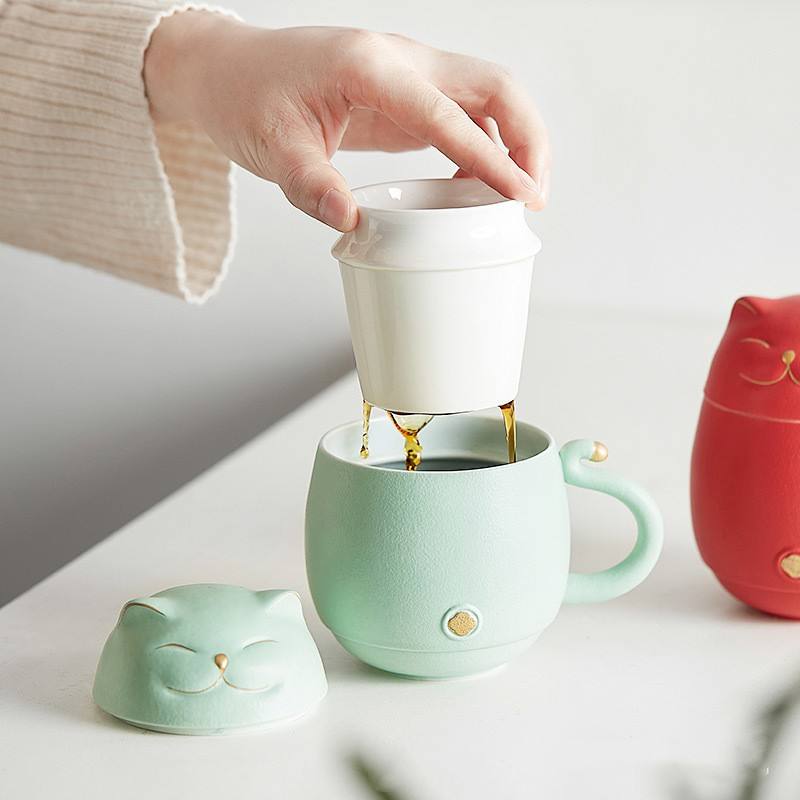 Description:Le chat chanceux a formé des tasses d'infuser de thé avec la poignée et le couvercle