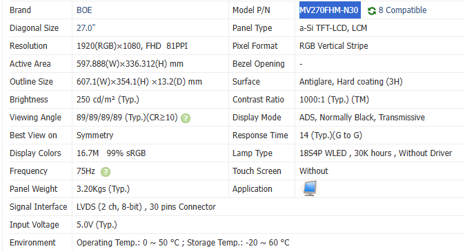 Écran LCD pour ordinateur portable MV270FHM-N30 27 pouces, luminosité 300 cd/m², panneau TFT 60 Hz, 1920x1080 FHD, anti-lumière bleue, garantie 1 an