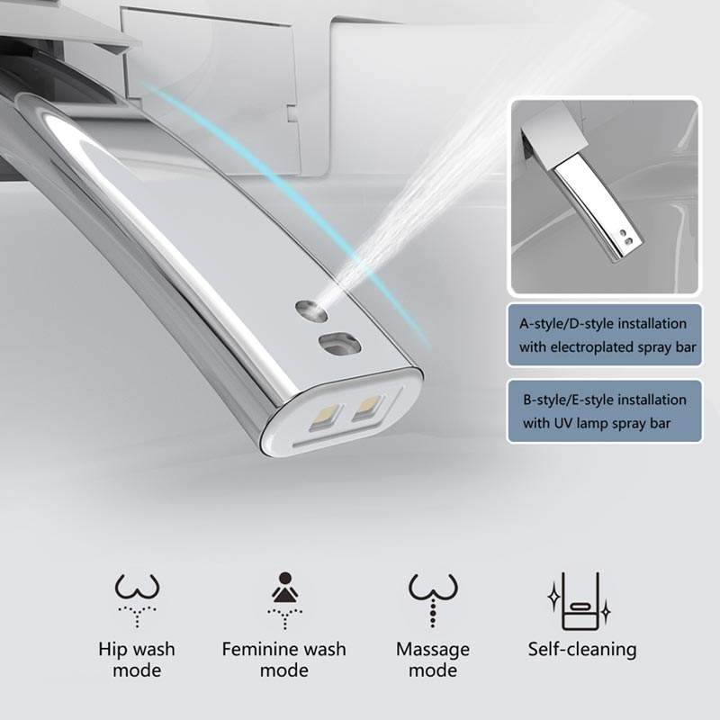Lave-femme, Pied capteur flush, Couverture automatique, Buse autonettoyante, Sesiège de chauffage, Nettoyage de la buse mobile, Séchage à l'air chaud, Type de chauffage instantané, Télécommande, Lavage de Fesses, Réglage de la pression de l'eau, Réglage de la température de l'eau, Nuit lumière, Mode enfants