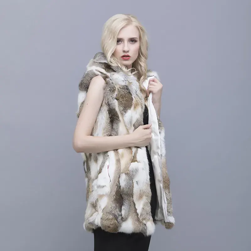 MWFur Hiver Mode Lapin Fourrure Gilet Sans Manches Gilet À Capuche Hiver Naturel Fourrure Gilet Grande Taille Femmes