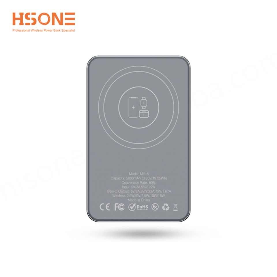 Banque d'alimentation ultra-mince en alliage d'aluminium MY15 L 5000mAh avec charge sans fil 15W, affichage LED pour une sauvegarde d'urgence et une utilisation portable