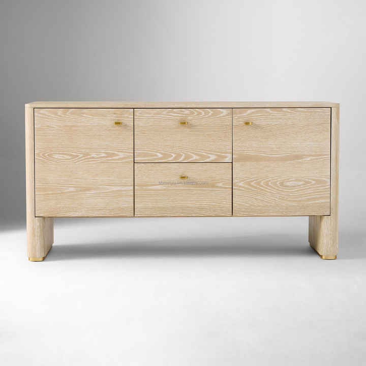 MYHOME 2025 Buffet Buffet Vitrine Moderne à 4 Portes en Chêne Massif de Style Français avec Finition Blanche Cerused pour Salle à Manger à la Maison