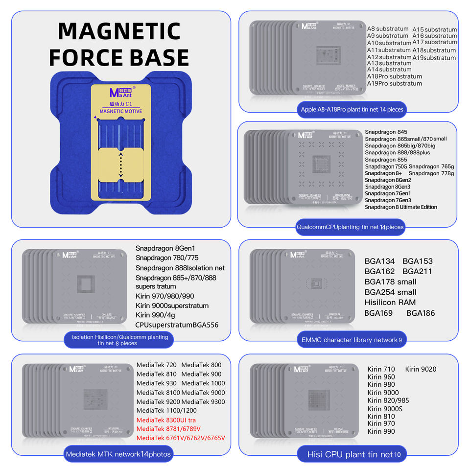 MaAnt C1 BGA Reballing Pochoir Plate-forme Tin Planting Chip Steel Mesh pour iPhone A8-A17 Carte Mère MTK EMMC Qualcomm HUAWEI CPU