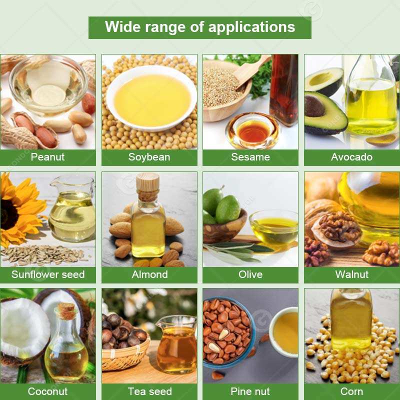 Almond Oil, Avocado Oil, Basil Oil, Coconut Oil, Corn Germ Oil, Cotton Seed Oil, Flax Seed Oil, Groundnut Oil, Mustard Oil, Olive Oil, Palm Oil, Peanut Oil, Pinenut Oil, Pumpkin Seed Oil, Rap Seed Oil, Rapeseed Oil, Safflower Seed Oil, Sesame Oil, Soybean Oil, Sunflower Seed Oil, Tea Seed Oil, Virgin Coconut Oil, Walnut Oil, Wheat Germ Oiloil type