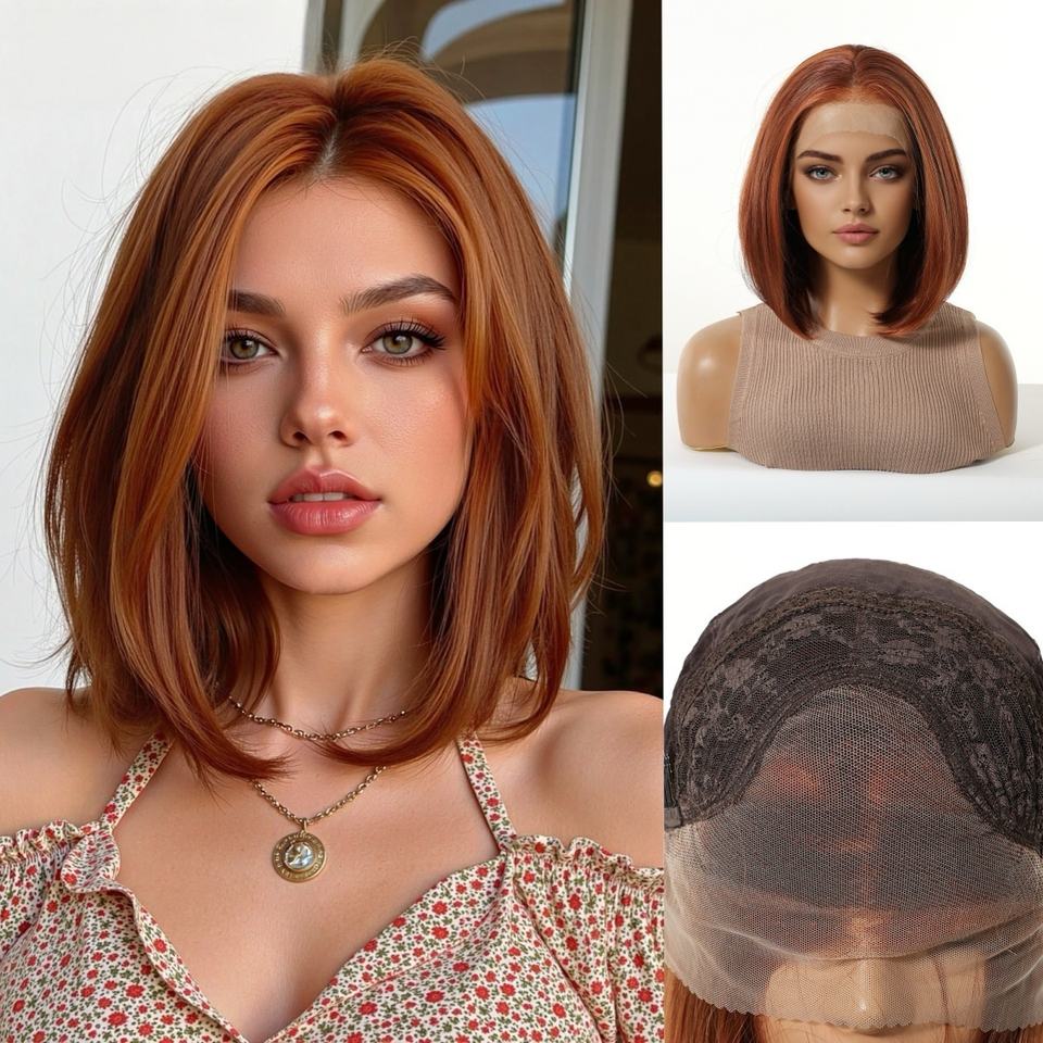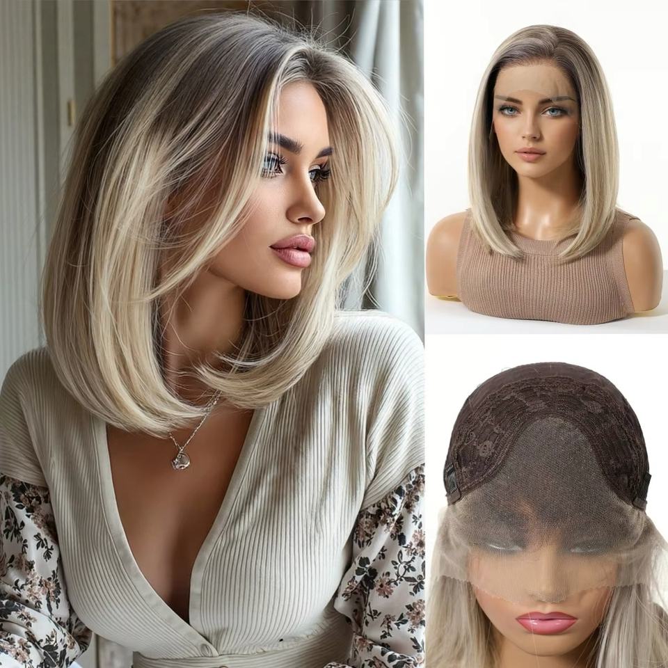 Perruque courte bob blonde dégradée, réaliste, naturelle et respirante, en fibre haute température 100%, avec dentelle 13*4, fabriquée à la machine au crochet