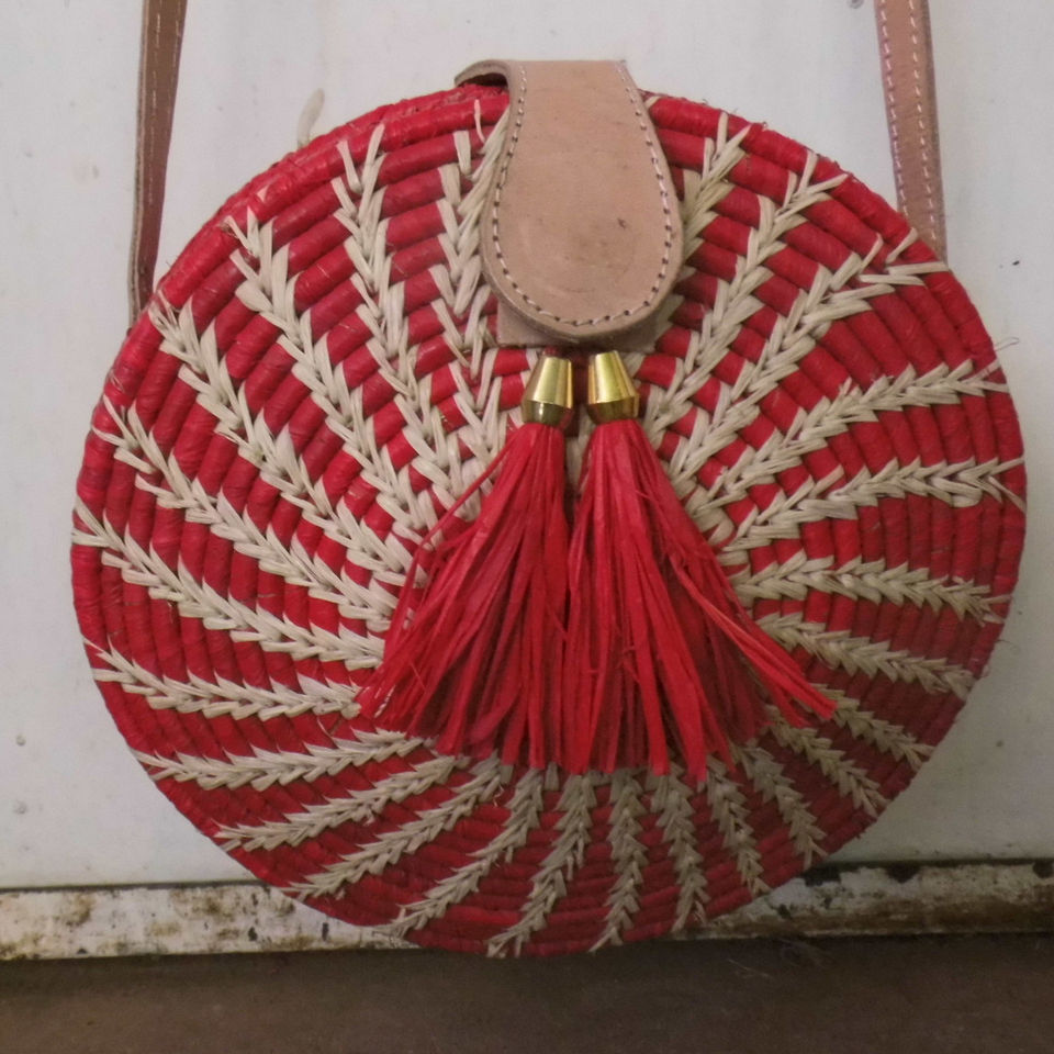 Madagascar Women's Trendy Style Crossbody Handbag Genuine Leather Straw Raffia Snap Button Closure Cotton Lining Two Tassels