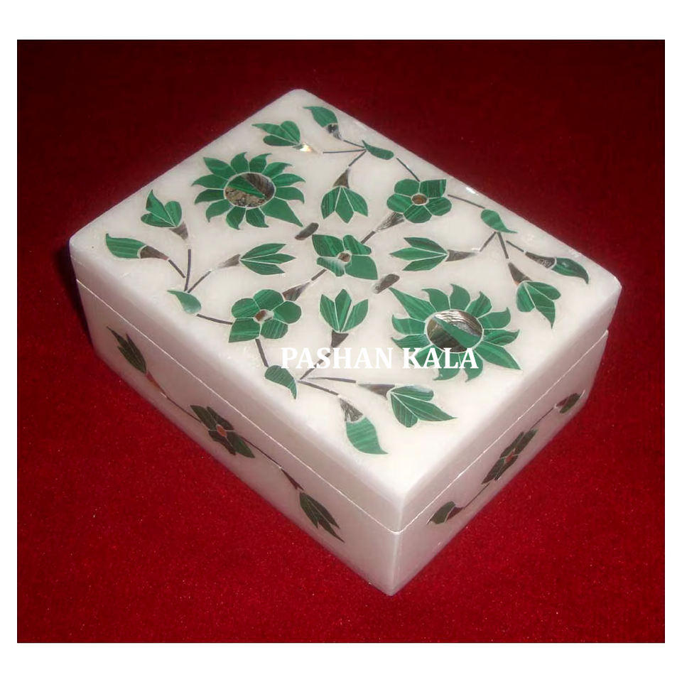 Belle boîte à bijoux faite à la main couleur verte incrustation fleur conception de marbre blanc forme rectangulaire utiliser boîte de décoration de la maison