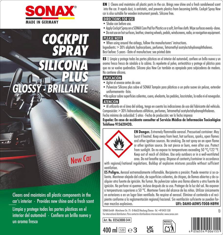 Fabriqué en Allemagne, marque SONAX GmbH, spray brillant pour l'entretien du cockpit, parfum de voiture neuve, nettoyant intérieur 400 ml