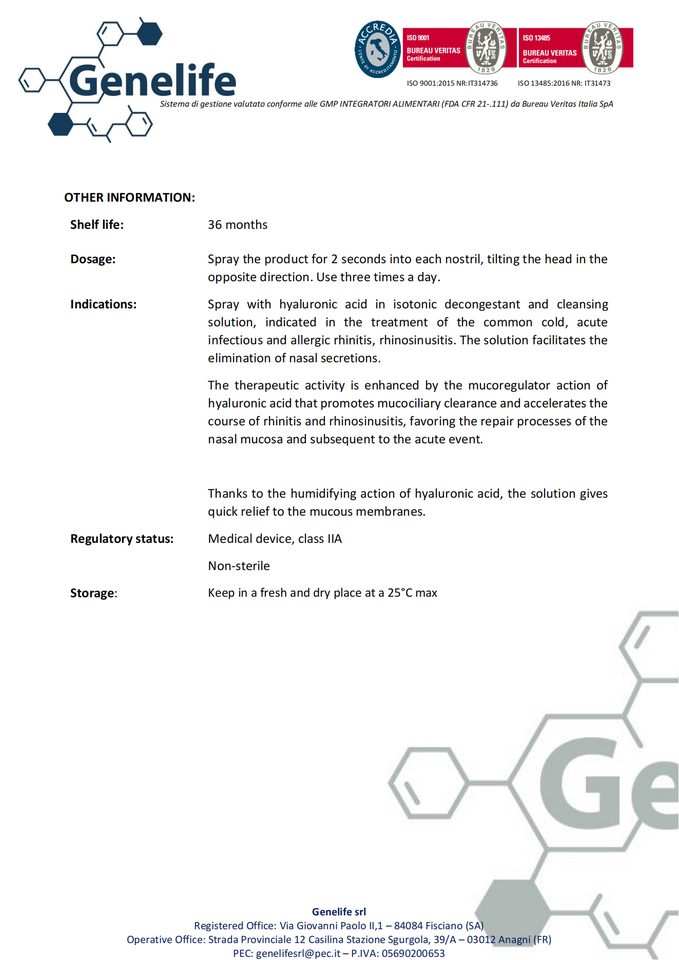 Spray nasal à l'acide hyaluronique de qualité supérieure fabriqué en Italie Fourniture de soins de santé de qualité supérieure pour le soulagement des muqueuses
