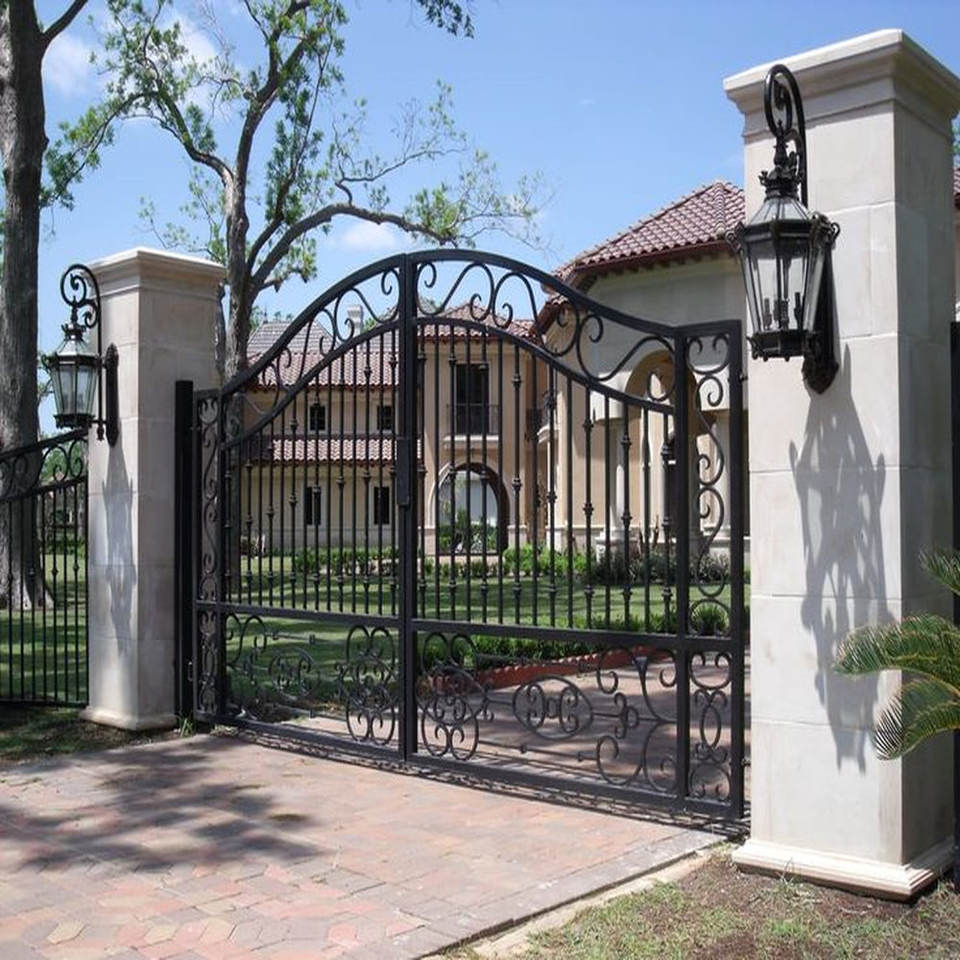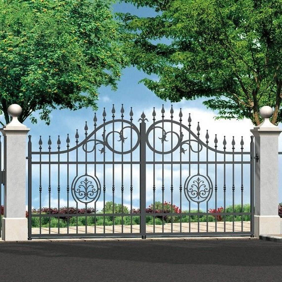 Made in Vietnam wrought iron main gate with decorative elements, forged iron frame and premium powder-coated surface
