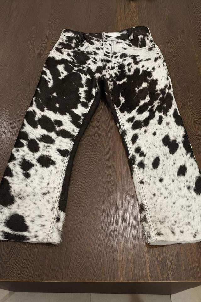 Pantalon en cuir de vachette sur mesure avec logo personnalisé, imprimé fourrure de vache, style western, pour homme.
