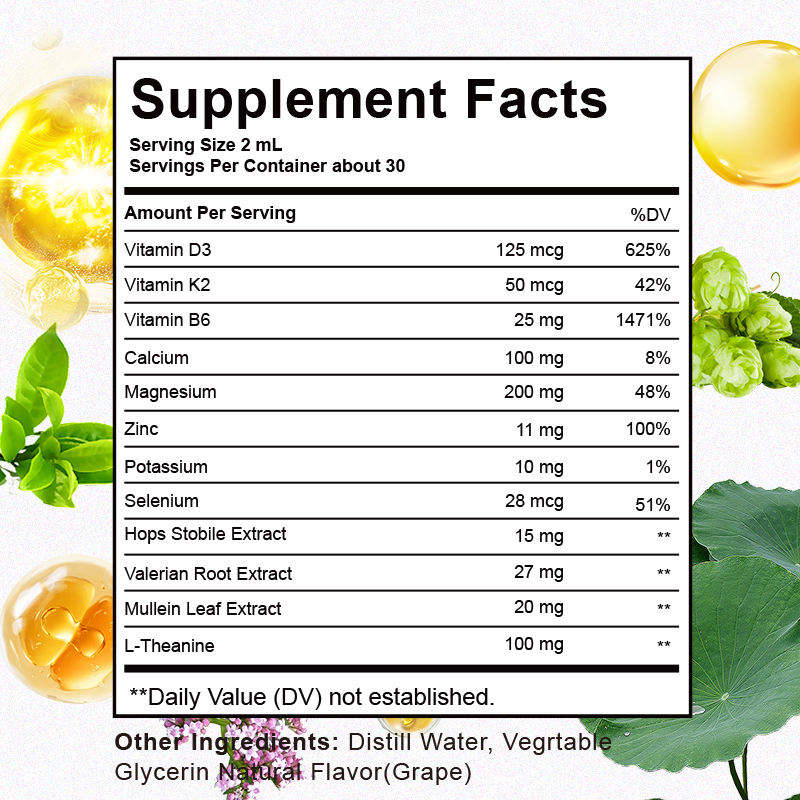 Gouttes liquides de magnésium, complément alimentaire pour le sommeil, avec vitamine D3, K2, B6, calcium, racine de valériane pour une humeur calme, la santé des muscles et des os