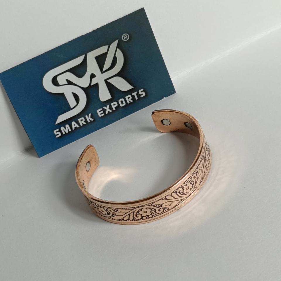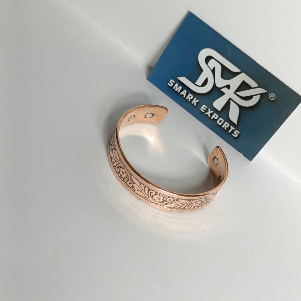 Bracelet manchette traditionnel en cuivre gravé magnétique, motif floral, artisanat métallique, ajustable, Kada en cuivre thérapeutique