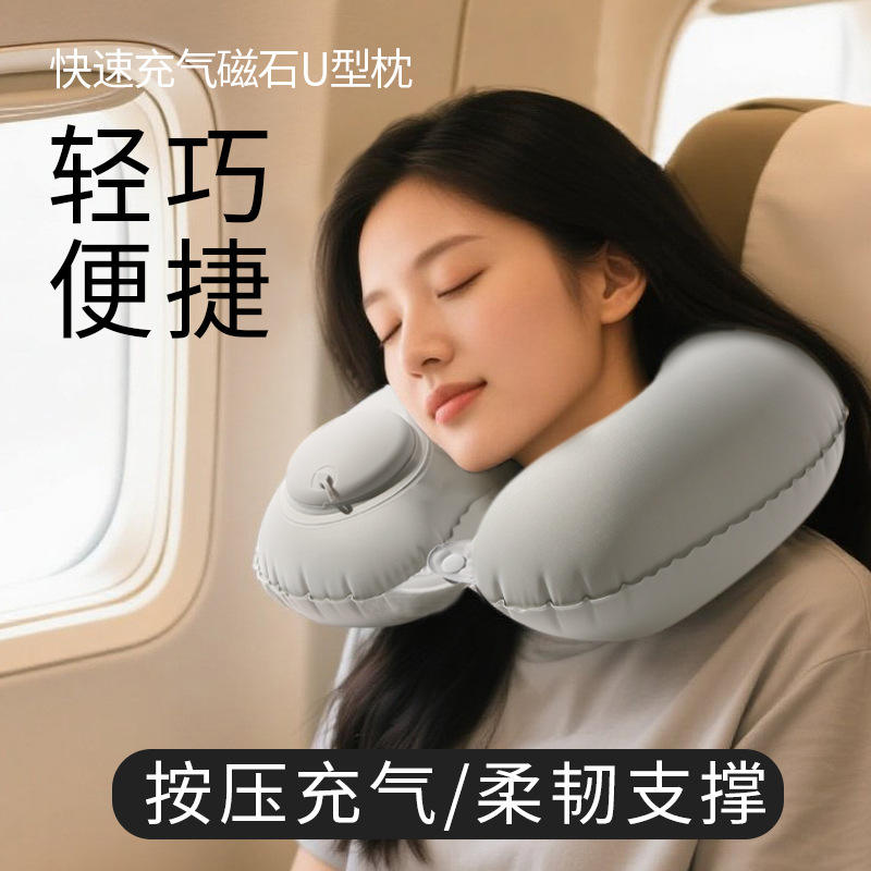 Oreiller de voyage gonflable magnétique en forme de U gris avec aimant 28x24x10cm, soutien du cou portable pour utilisation en avion