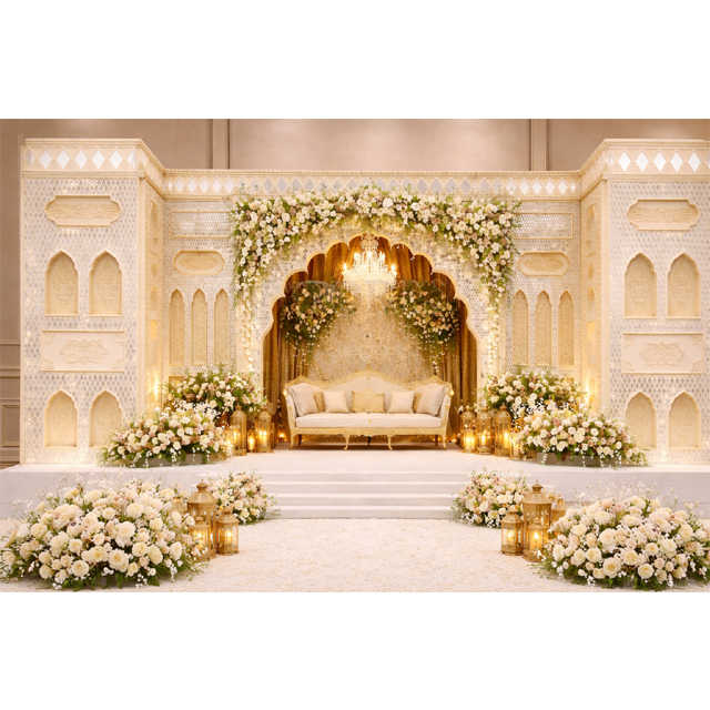 Magnifiques panneaux muraux de fond de scène miroir modernes de style palais pour mariage, thème indien et arabe, décoration de mariage musulman, en fibre de verre, Inde