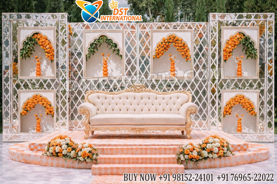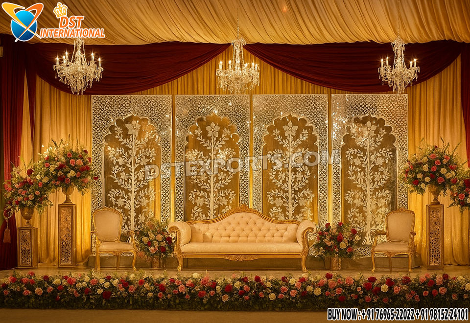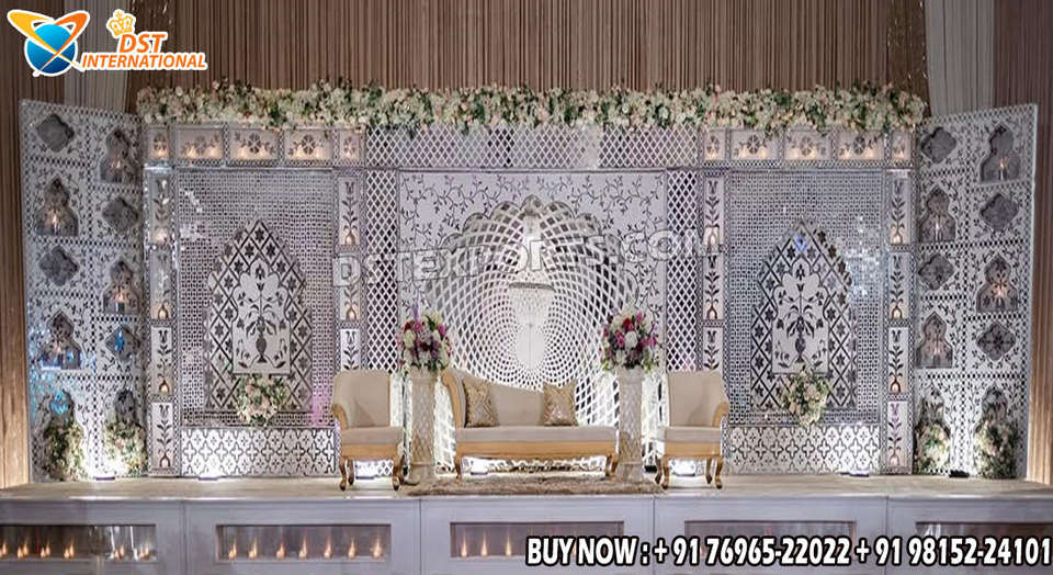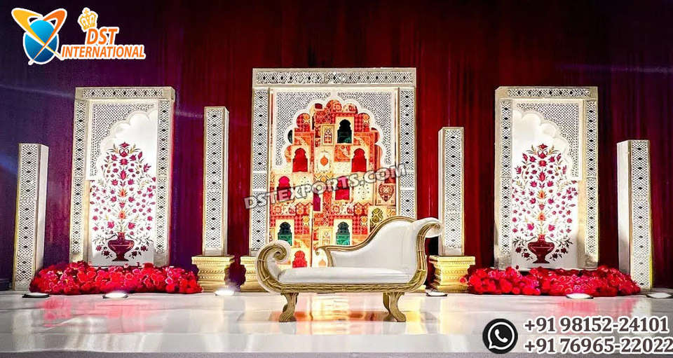 Magnifique scène de mariage de style palais avec miroir, décoration de scène de mariage élégante de style moghol, acheter en gros des panneaux en bois blancs aux États-Unis