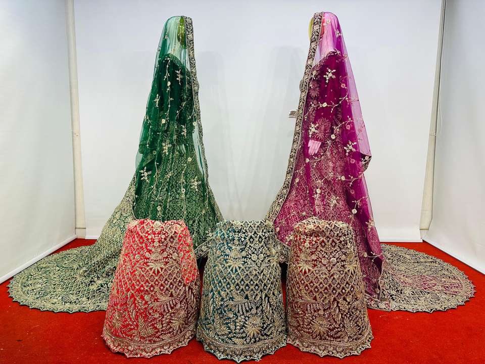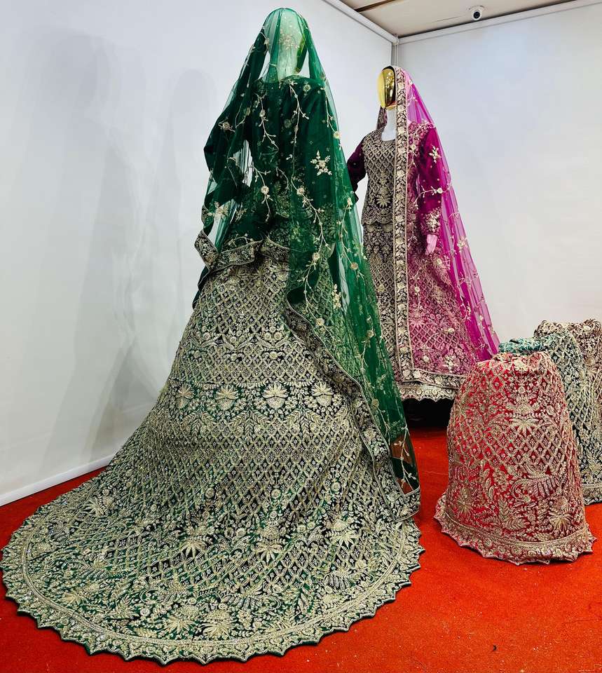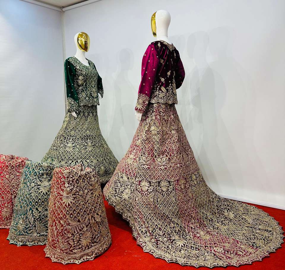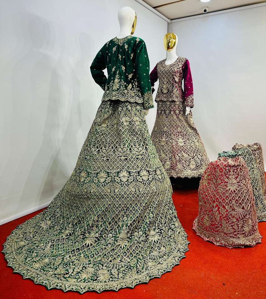 Mahamantra Velvet Lehenga Choli Crop Trail Cut Full Big Trail Allover Jarkan Stones Embroidered Floor-Length Wedding Wear