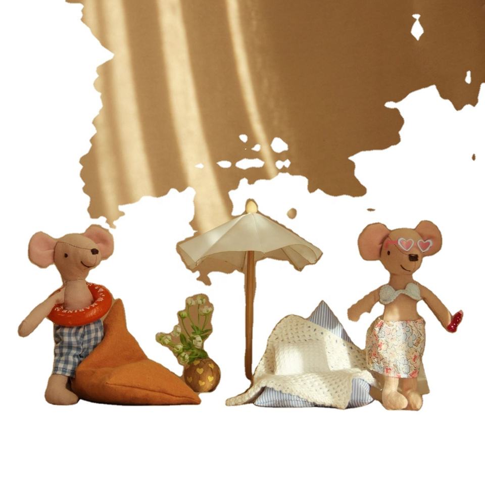Ensemble de jeu miniature de vacances à la plage style Maileg, poupée en peluche souris avec pouf et parasol, modèle de décoration intérieure en tissu doux, cadeau