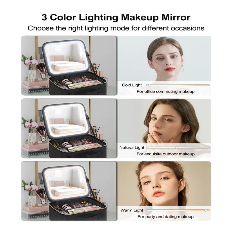 Trousse de maquillage avec miroir LED, trousse de maquillage de voyage pour femmes, organiseur de cosmétiques, grandes trousses de maquillage avec séparateurs ajustables