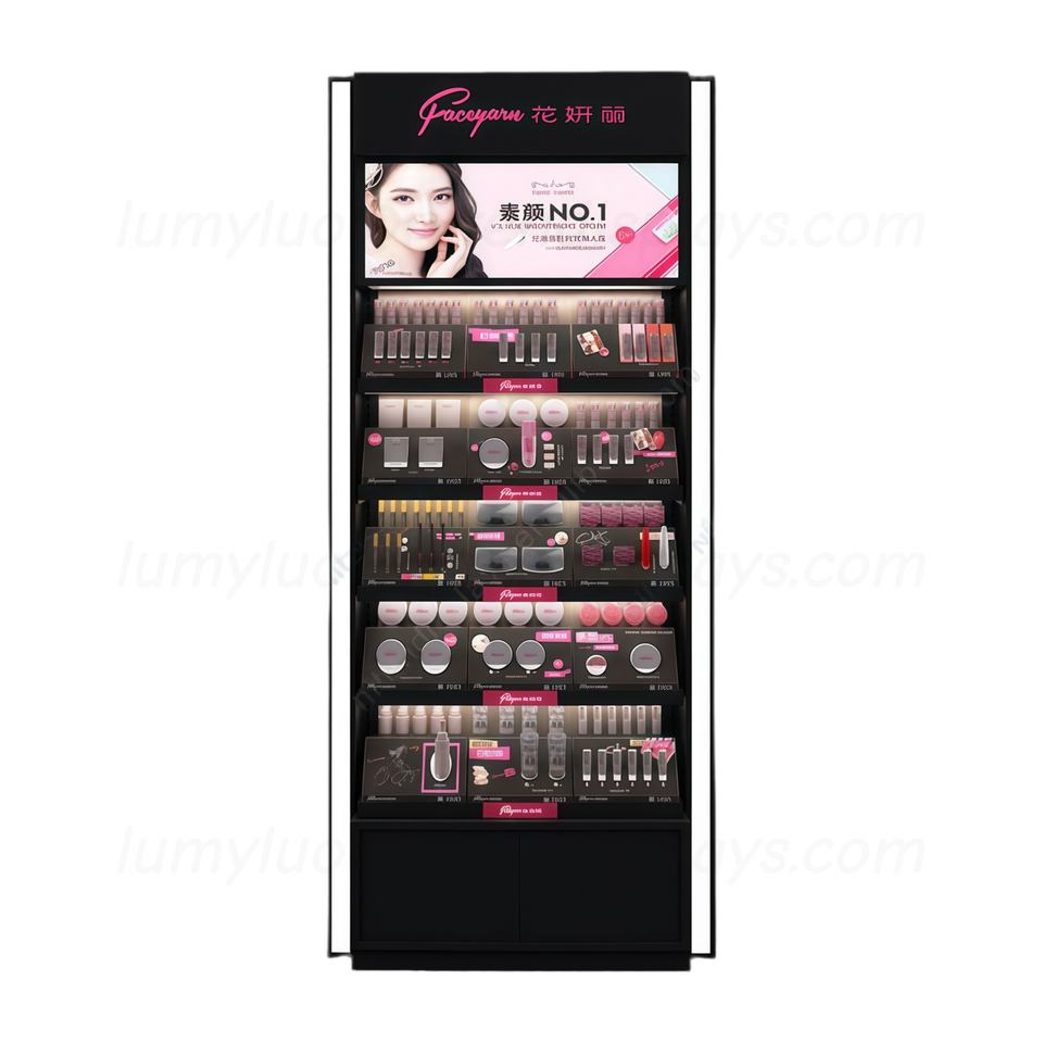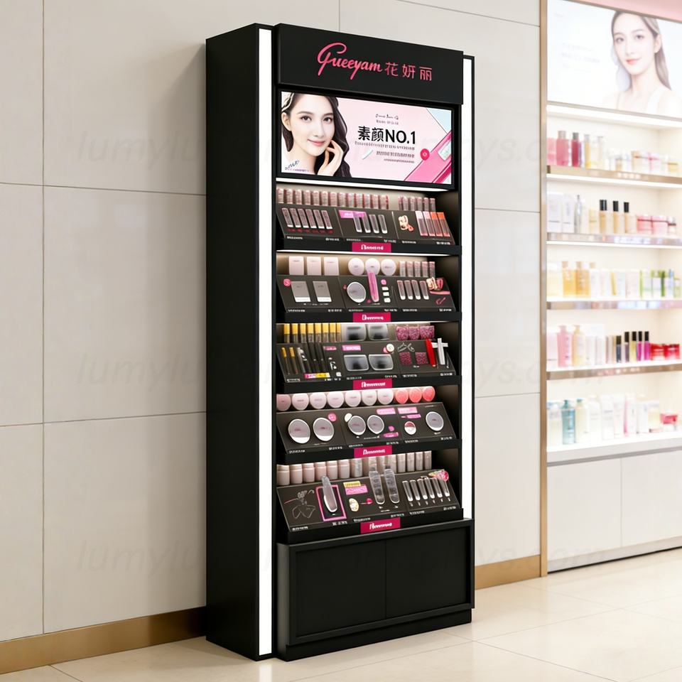 Vitrine de présentation pour magasin de maquillage en bois avec éclairage LED, tiroirs et service de conception gratuit pour les nouvelles marques
