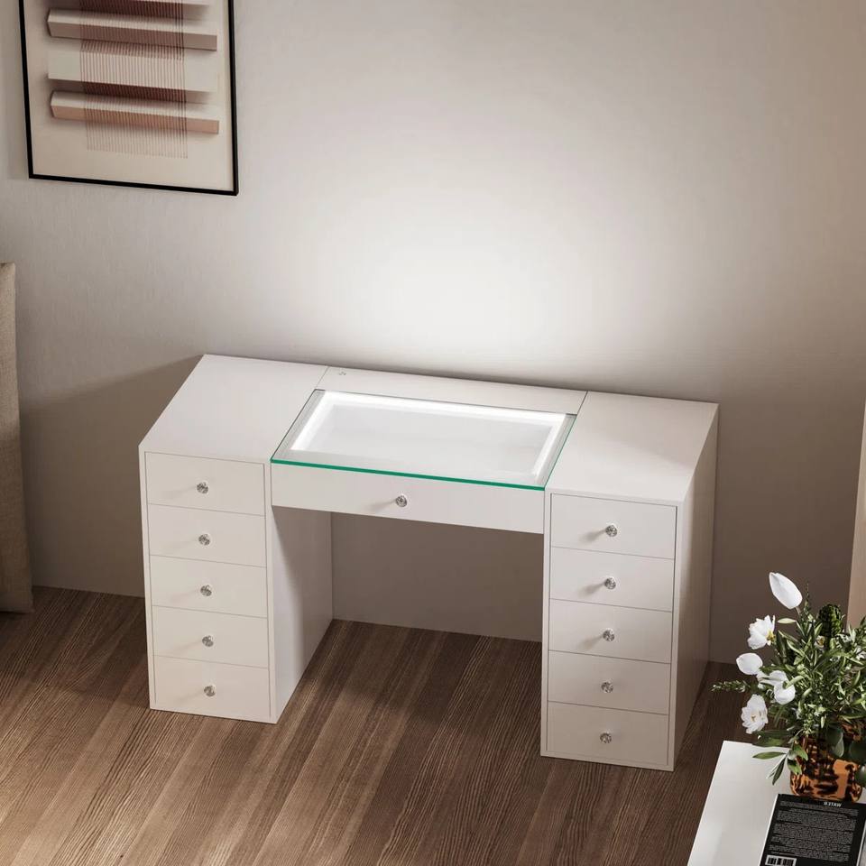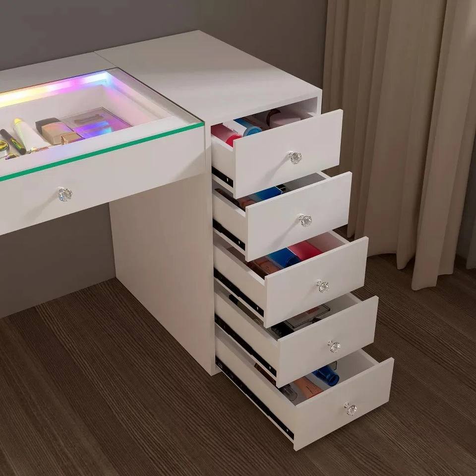 Coiffeuse avec prise de courant et miroir éclairé, bureau de coiffeuse avec 11 tiroirs, plateau en verre, lumières d'ambiance RVB réglables pour la chambre à coucher