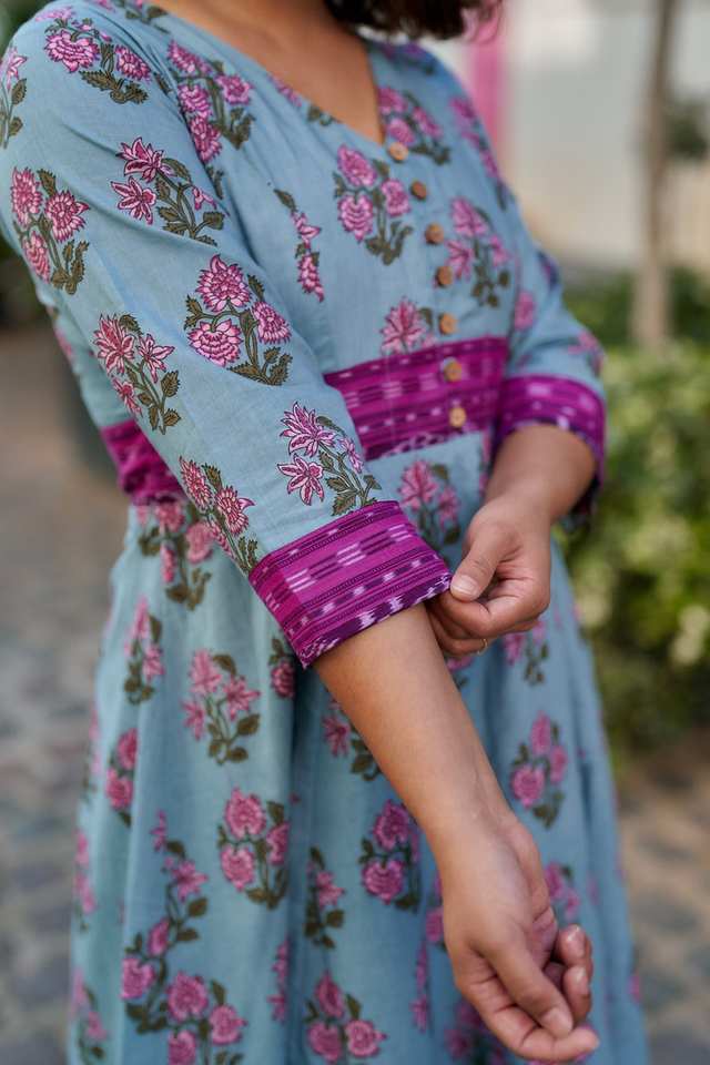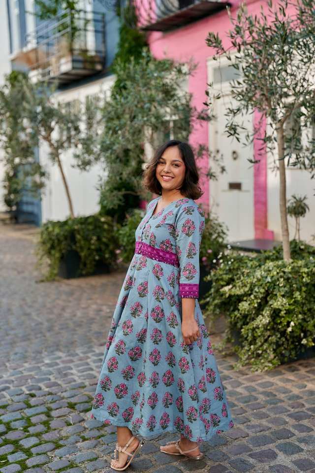 Robe bohème florale Malia, imprimée à la main, longueur mollet, en coton