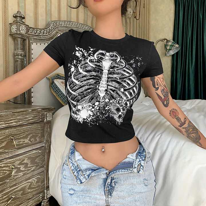 Center commercial Goth Squelette Imprimer Foncé Femmes de T-shirts Y2K-Bodycon Punk Harajuku Crop Top Gothique Vêtements Tee Shirt Femme 2021