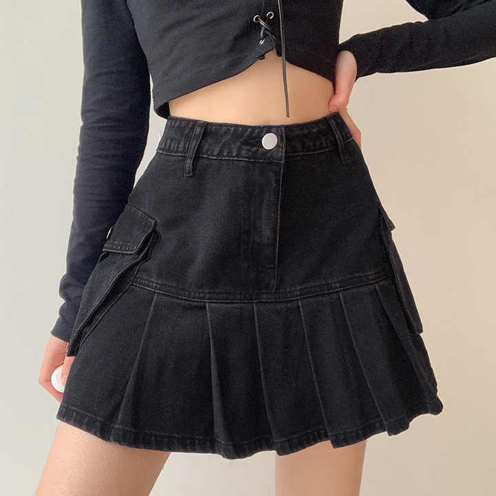Mall Goth Y2k Natural Waist Mini Jean Skirts E-girl Esthétique Denim noir avec de grandes poches Vintage Grunge Punk Outfits